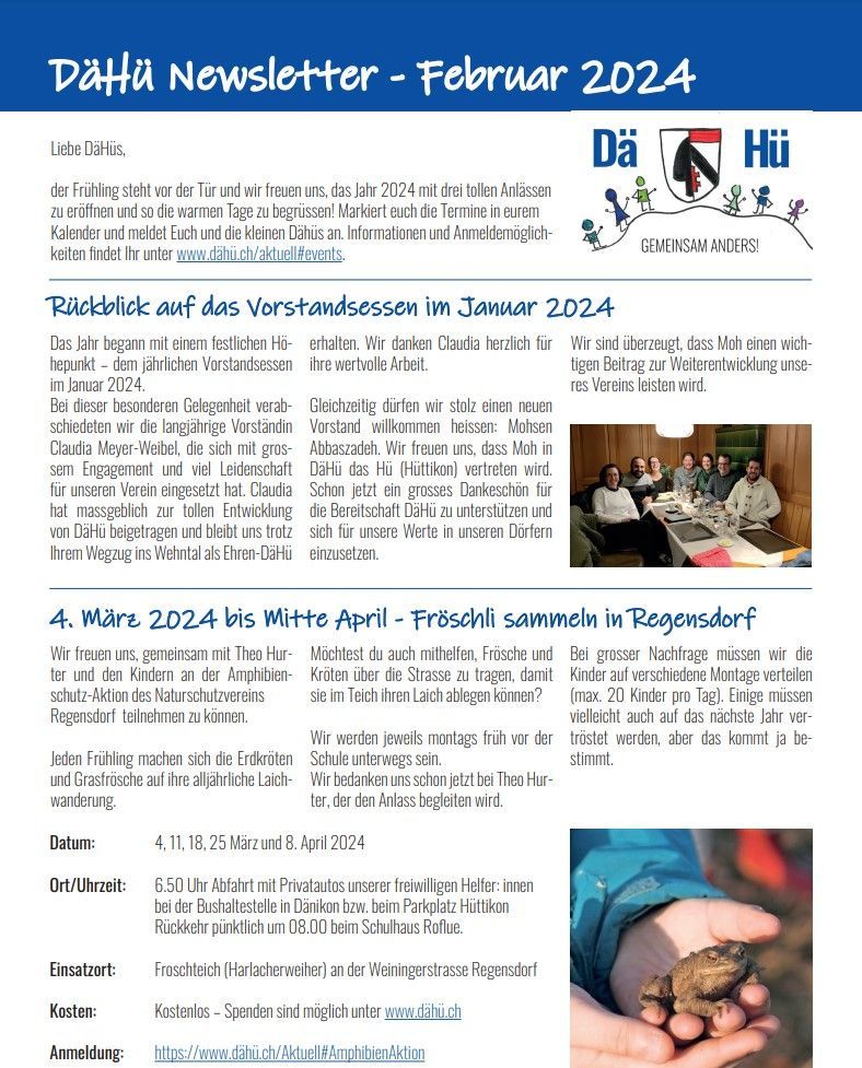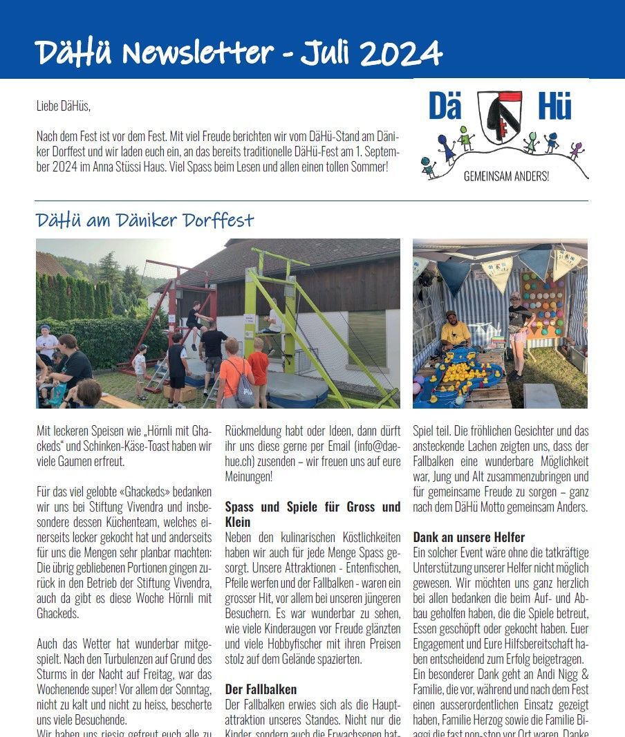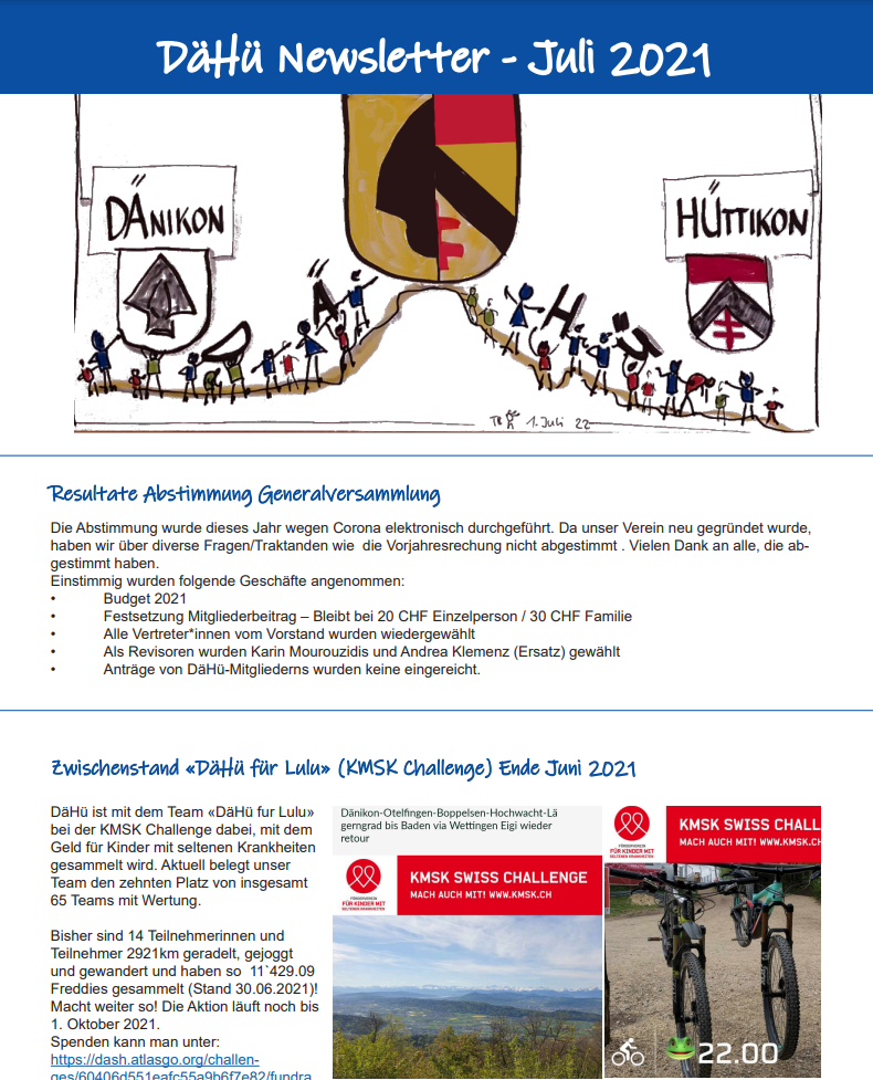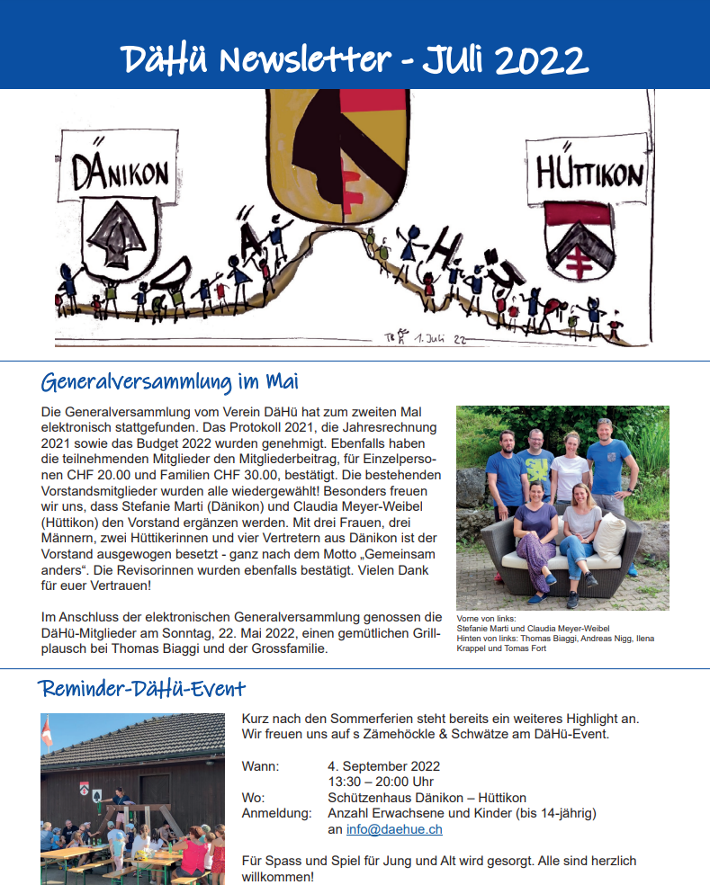 Unter anderem mit den Resultaten der Generalversammlung und den Details zum «DäHü verbindet» Event am 4. September.