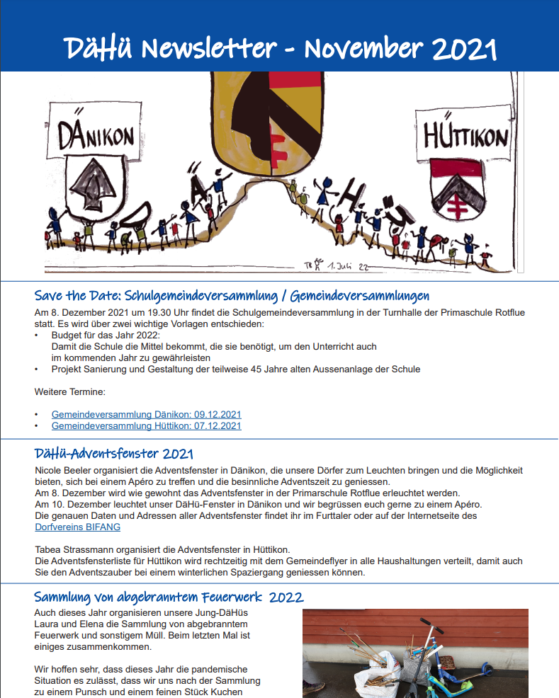 Schulgemeindeversammlung , Adventsfenster in Dänikon / Hüttikon und Feuerwerksammlung am Neujahrstag!
